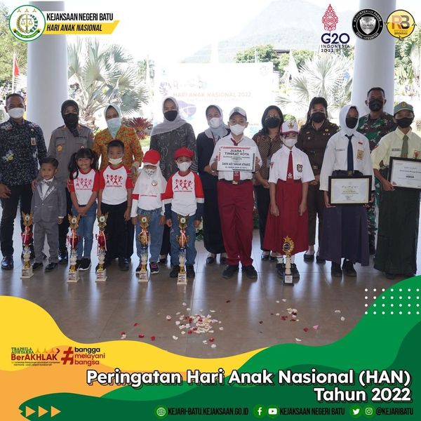 Pada hari ini, Selasa tanggal 26 Juli 2022 pukul 08:00 WIB bertempat di halaman Balaikota Among Tani Kota Batu, telah dilaksanakan kegiatan Peringatan Hari Anak Nasional (HAN) Tahun 2022 bersama Walikota Batu Dra. Hj. Dewanti Rumpoko