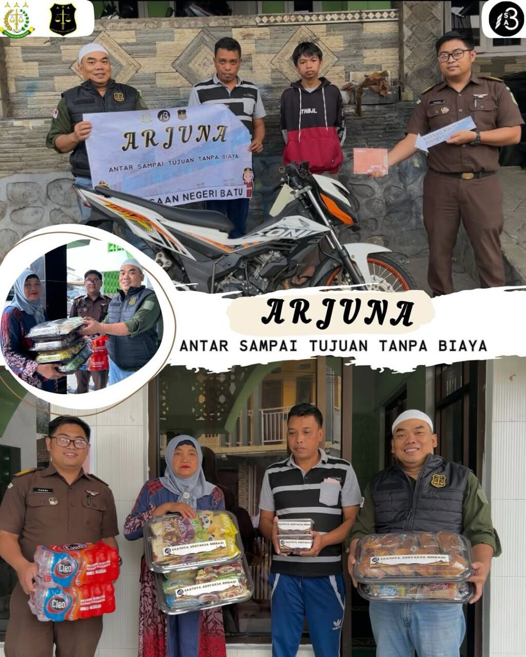 Salah satu program pelayanan kepada masyarakat khusus pengembalian barang bukti kepada pemilik yang sah tanpa dipungut biaya alias GRATIS. Pada hari ini Rabu tanggal 11 Maret 2025 di Bulan Suci Romadhon 1446 H Program Arjuna kembali hadir untuk mengembalikan 1 (satu) unit kendaraan bermotor roda dua kepada pemiliknya, Seksi Penelusuran Aset dan Pengelolaan Barang Bukti Kejaksaan Negeri Batu juga berkesempatan melakukan bagi takjil kepada pengurus Mushola yang terletak tidak jauh dari rumah pemilik kendaraan bermotor