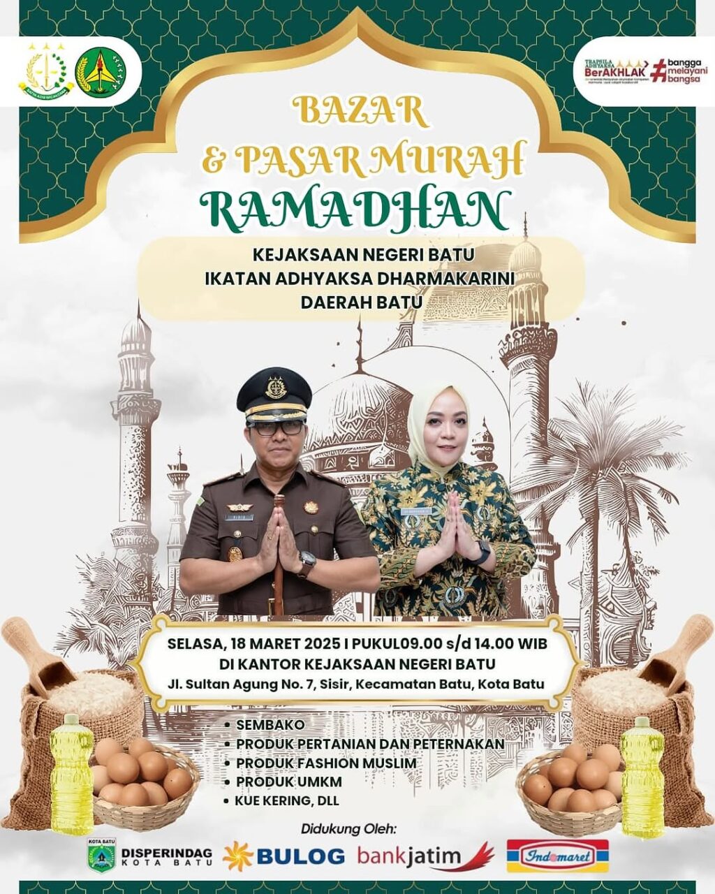 Ayo… Datang dan meriahkan acara Bazar & Pasar Murah Ramadhan Kejaksaan Negeri Batu & Ikatan Adhyaksa Dharmakarini Daerah Batu pada hari Selasa, 18 Maret 2025 Pukul 09:00-14:00 WIB bertempat di Kantor Kejaksaan Negeri Batu