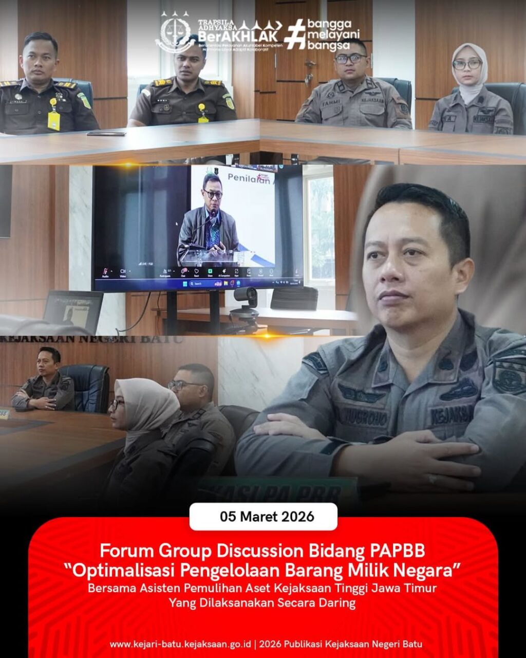 Pada hari ini, Kamis tanggal 05 Maret 2026 mulai pukul 13.00 WIB bertempat di Aula Vicon Kantor Kejaksaan Negeri Batu telah dilaksanakan kegiatan Forum Group Discussion (FGD) Bidang Pemulihan Aset dan Pengelolaan Barang Bukti dengan tema “Optimalisasi Pengelolaan Barang Milik Negara”, yang dibuka oleh Asisten Pemulihan Aset Kejaksaan Tinggi Jawa Timur Dr. Muhammad Irean Datuding, S.H., M.H., dan diikuti oleh Kepala Seksi Pemulihan Aset dan Pengelolaan Barang Bukti (PAPBB) Kejaksaan Negeri Batu Kurnia Aji Nugraha, S.H., M.G., bersama seluruh jajaran Bidang PAPBB Kejaksaan Negeri Batu secara virtual
