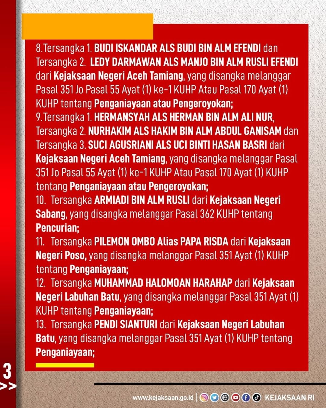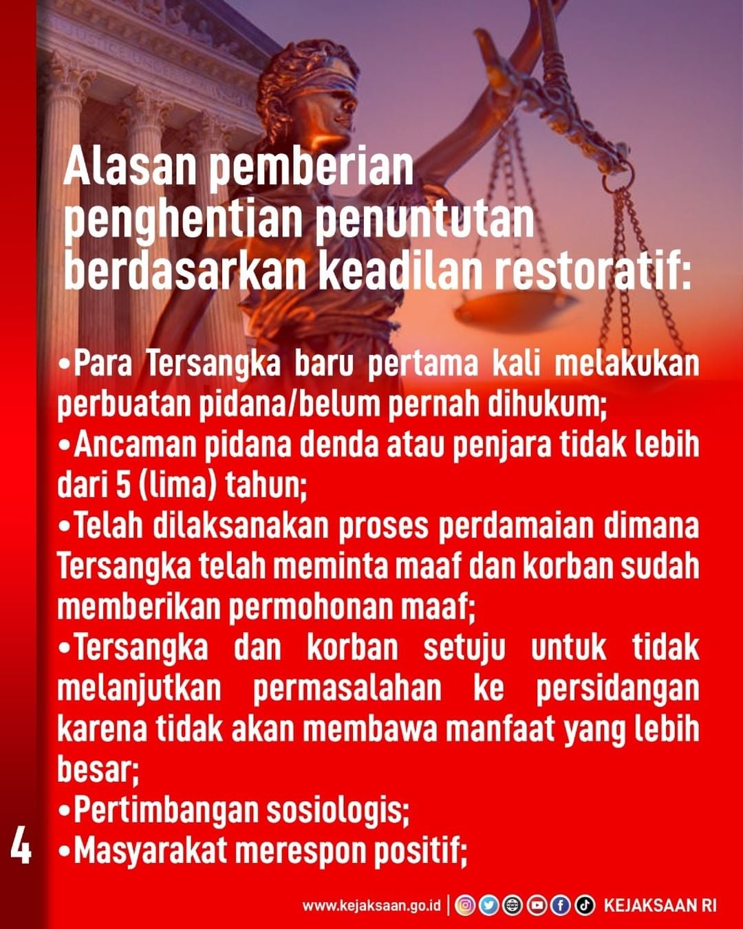 Senin 07 Maret 2022, Jaksa Agung Muda Tindak Pidana Umum Dr. Fadil Zumhana melakukan ekspose dan menyetujui 13 (tiga belas) Permohonan Penghentian Penuntutan Berdasarkan Keadilan RestoratifSelanjutnya Jaksa Agung Muda Tindak Pidana Umum mengapresiasi upaya Kepala Kejaksaan Negeri dan Kepala Cabang Kejaksaan Negeri dalam upaya perdamaian dan penyelesaian perkara mediasi penal (mediasi di luar pengadilan) antara Tersangka dan korban sehingga tidak perlu sampai ke persidangan. Upaya tersebut mempertimbangkan syarat formil dan materiil serta aspek yuridis, sosiologis, dan filosofisJaksa Agung Muda Tindak Pidana Umum menyampaikan bahwa penghentian penuntutan berdasarkan keadilan restoratif (restorative justice) merupakan penyelesaian perkara tindak pidana dengan melibatkan pelaku, korban, keluarga pelaku/korban, dan masyarakat/pihak lain yang terkait, untuk bersama-sama mencari penyelesaian yang adil dengan menekankan pemulihan kembali pada keadaan semula, dan bukan pembalasan“Dalam penghentian penuntutan berdasarkan keadilan restoratif, perdamaian merupakan syarat mutlak yang tidak bisa diabaikan oleh JaksaTanpa adanya perdamaian yang dilakukan dengan melibatkan keluarga pelaku dan korban serta masyarakat sekitar, maka penghentian penuntutan berdasarkan keadilan restoratif tidak dapat dilakukan,” ujar Jaksa Agung Muda Tindak Pidana UmumSelanjutnya, Jaksa Agung Muda Tindak Pidana Umum memerintahkan kepada Para Kepala Kejaksaan Negeri dan Kepala Cabang Kejaksaan Negeri akan menerbitkan Surat Ketetapan Penghentian Penuntutan (SKP2) Berdasarkan Keadilan Restoratif, sesuai Peraturan Jaksa Agung Nomor 15 Tahun 2020 tentang Penghentian Penuntutan Berdasarkan Keadilan Restoratif dan Surat Edaran Jaksa Agung Muda Tindak Pidana Umum Nomor 01 tanggal 10 Februari 2022, sebagai perwujudan kepastian hukum