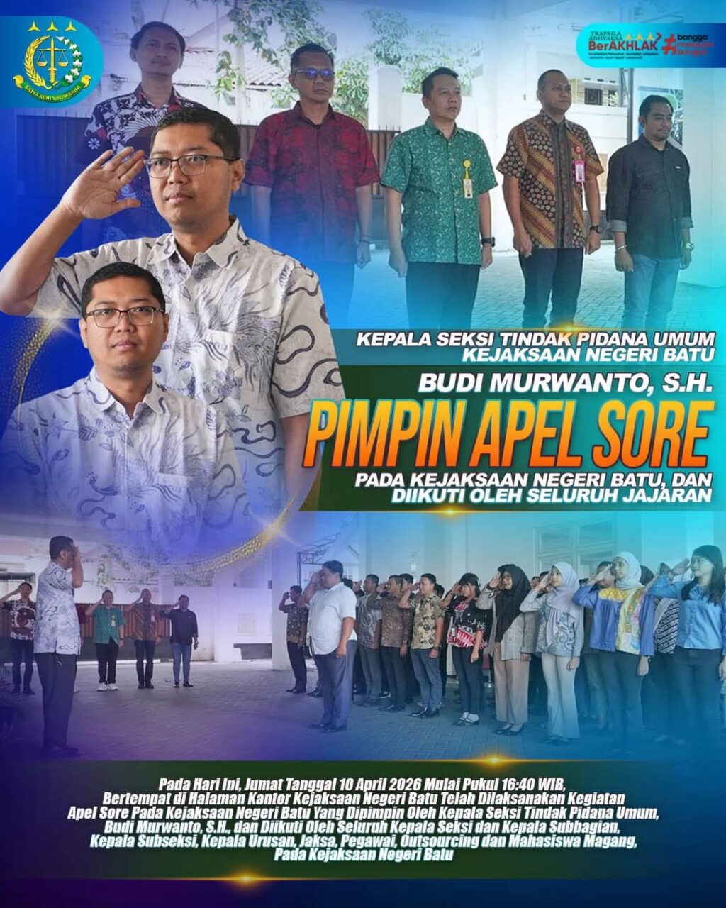Pada hari ini, Jumat tanggal 10 April 2026 mulai pukul 16:40 WIB bertempat di Halaman Kantor Kejaksaan Negeri Batu telah dilaksanakan kegiatan Apel Sore Hari Jumat pada Kejaksaan Negeri Batu yang dipimpin secara langsung oleh Kepala Seksi Tindak Pidana Umum Kejaksaan Negeri Batu Budi Murwanto, S.H., dan diikuti oleh para Kasi, Kasubsi, Kaur, Jaksa, Pegawai dan PPNPN pada Kejaksaan Negeri Batu.