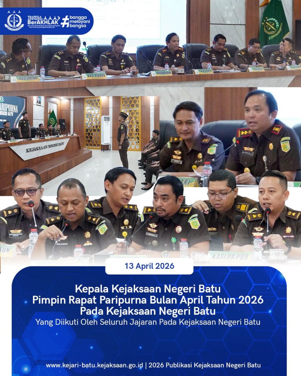 Pada hari ini, Senin tanggal 13 April 2026 mulai pukul 09.00 WIB bertempat di Aula Adhyaksa Kantor Kejaksaan Negeri Batu telah dilaksanakan kegiatan Rapat Paripurna Bulan April Tahun 2026 yang dipimpin secara langsung oleh Kepala Kejaksaan Negeri Batu Arya Wicaksana, S.H., M.H., dan dihadiri pula oleh Para Kasi, Kasubag, Kasubsi, Kaur, Jaksa dan Pegawai pada Kejaksaan Negeri Batu.