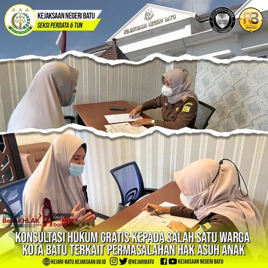 Pada hari ini, Senin tanggal 13 Juni2022 pukul 11.00 WIB bertempat di Ruang Konsultasi Hukum Kantor Kejaksaan Negeri Batu, Jaksa Pengacara Negara (JPN) Kejari Batu melaksanakan kegiatan Pelayanan Konsultasi Hukum Gratis kepada salah satu Warga Kota Batu, terkait Permasalahan Hak Asuh Anak. Adapun kegiatan tersebut dilaksanakan sebagai salah satu fungsi dari Seksi Perdata dan Tata Usaha Negara Kejaksaan Negeri Batu