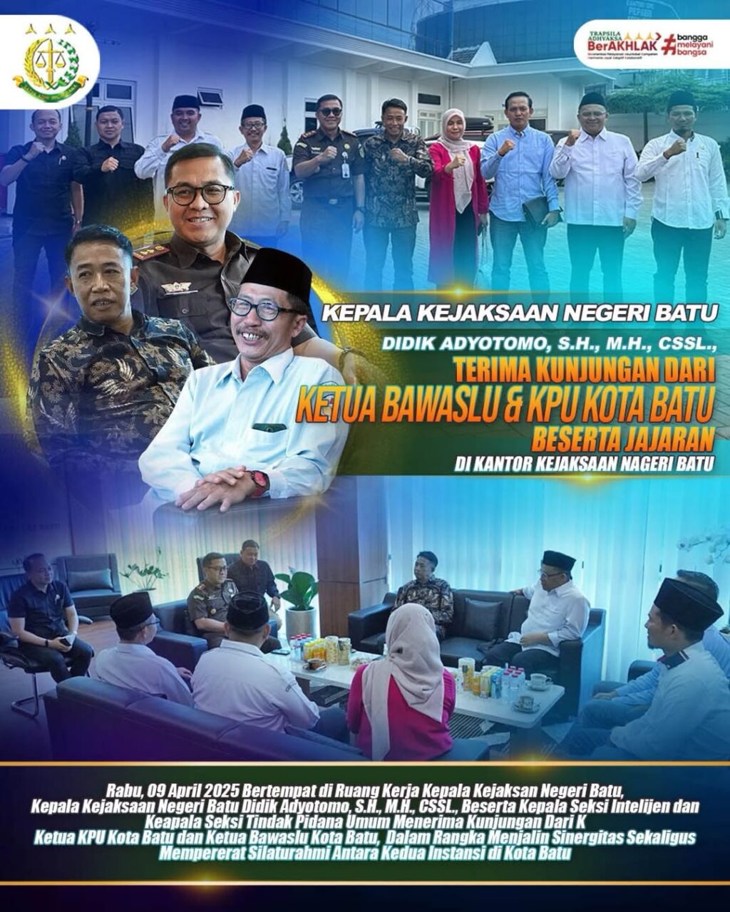Pada hari ini, Rabu tanggal 09 April 2025 mulai pukul 09:00 WIB bertempat di Ruang Kerja Kepala Kejaksaan Negeri Batu, telah dilaksanakan kegiatan Koordinasi dan Silaturahmi yang dihadiri secara langsung oleh Ketua KPU Kota Batu Heru Joko Purwanto dan Ketua Bawaslu Kota Batu Supriyanro beserta Jajaran dan diterima secara langsung oleh Kepala Kejaksaan Negeri Batu Didik Adyotomo, S.H., M.H., CSSL., bersama Kepala Seksi Intelijen dan Kepala Seksi Tindak Pidana Umum Kejaksaan Negeri Baty