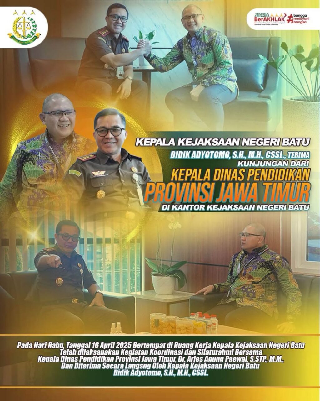 Pada hari Rabu tanggal 16 April 2025 mulai pukul 08:00 WIB bertempat di Ruang Kerja Kepala Kejaksaan Negeri Batu, telah dilaksanakan kegiatan Koordinasi dan Silaturahmi yang dihadiri secara langsung oleh Kepala Dinas Pendidikan Provinsi Jawa Timur Aries Agung Paewai, S.STP., M.M., dan diterima secara langsung oleh Kepala Kejaksaan Negeri Batu Didik Adyotomo, S.H., M.H., CSSL.