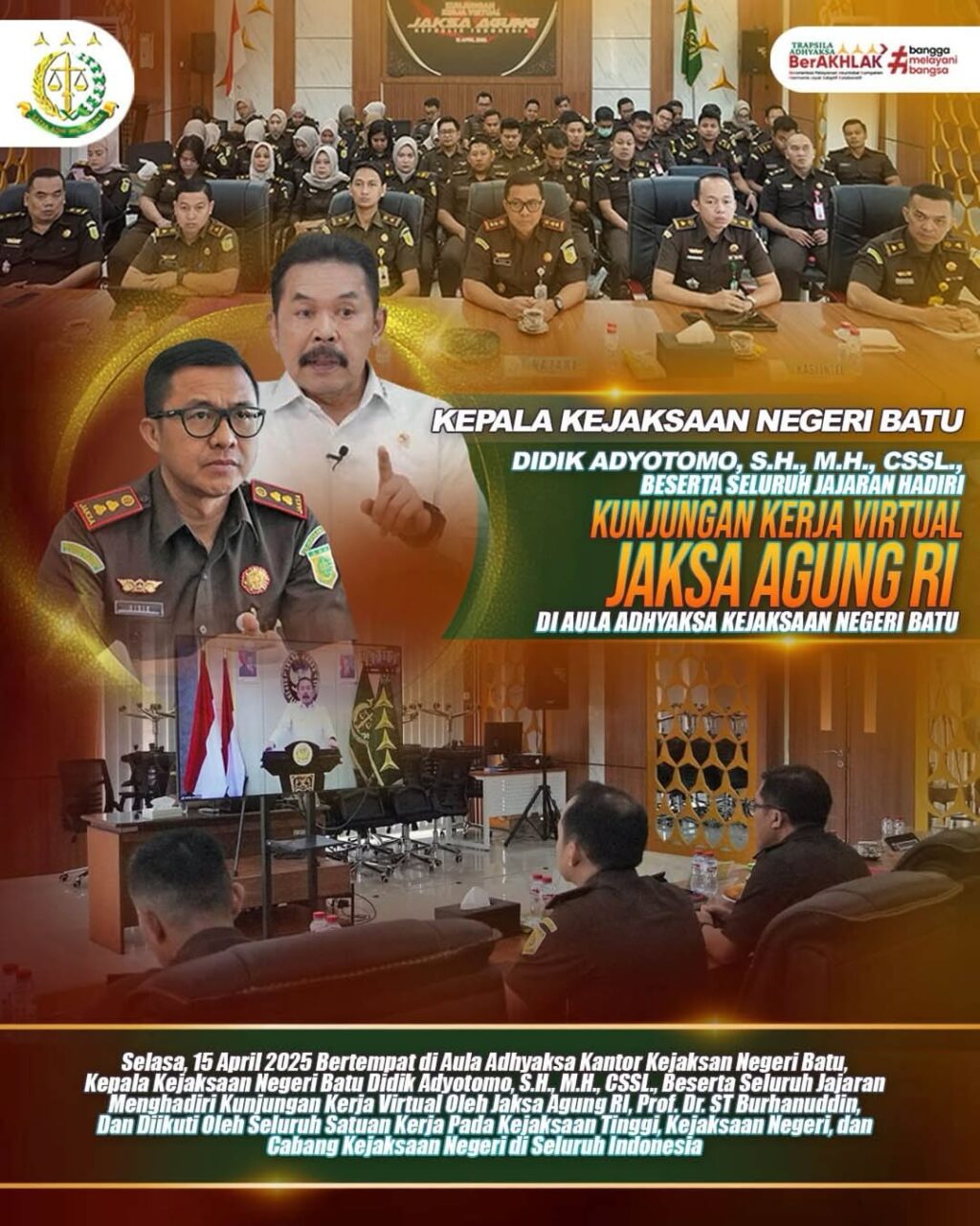 Pada hari ini, Selasa tanggal 15 April 2025 mulai pukul 09:00 WIB betempat di Aula Adhyaksa Kantor Kejaksaan Negeri Batu telah dipaksanakan kegiatan Kunjungan Kerja Virtual Jaksa Agung RI Prof. Dr. ST Burhanuddin, tang diikuti secara virtual oleh Kepala Kejaksaan Negeri Batu Didik Adyotomo, S.H., M.H., CSSL., beserta Seluruh Jajaran.