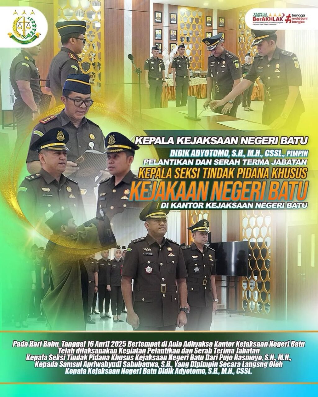 Pada hari Rabu, tanggal 16 April 2025 mulai pukul 09:30 WIB bertempat di Aula Adhyaksa Kejaksaan Negeri Batu telah dilaksanakan kegiatan Pelantikan dan Serah Terima Jabatan Kepala Seksi Tindak Pidana Khusus dari Pujo Rasmoyo, S.H., M.H., yang bertugas di Kejaksaan Negeri Kabupaten Kediri, dan digantikan oleh Samsul Apriwahyudi Sahubauwa, S.H., yang dipimpin secara langsung oleh Kepala Kejaksaan Negeri Batu Didik Adyotomo, S.H., M.H., CSSL.