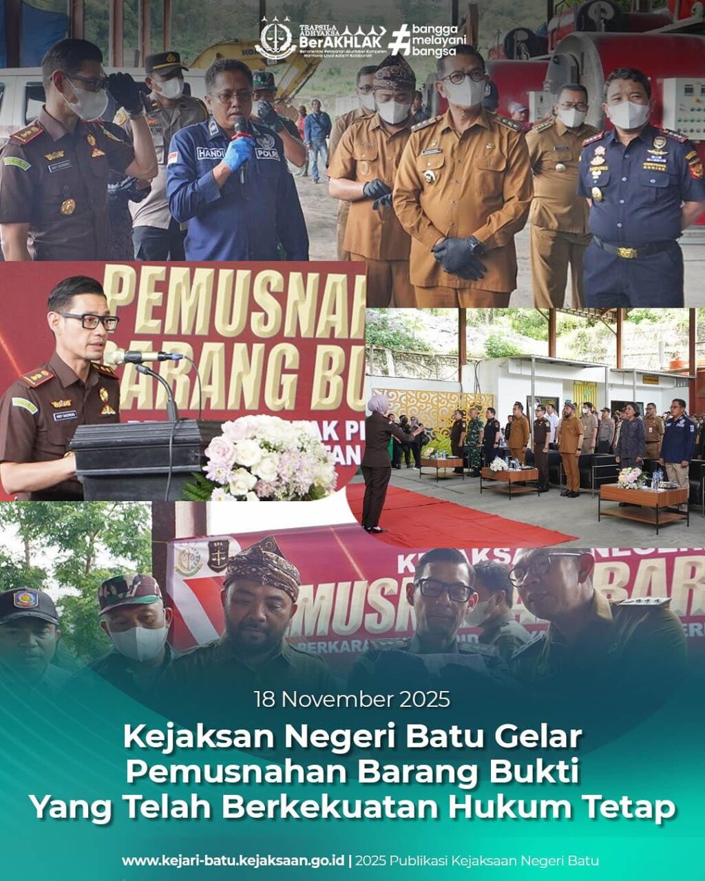 Pada hari ini, Selasa tanggal 18 November 2025 mulai pukul 10:00 WIB bertempat di Tempat Pembuangan Akhir (TPA) Tlekung Kota Batu, telah dilaksanakan kegiatan Pemusnahan Barang Bukti Perkara Tindak Pidana yang Telah Memiliki Kekuatan Hukum Tetap dalamperiode Bulan Juli 2025 sampai dengan Bulan Oktober 2025