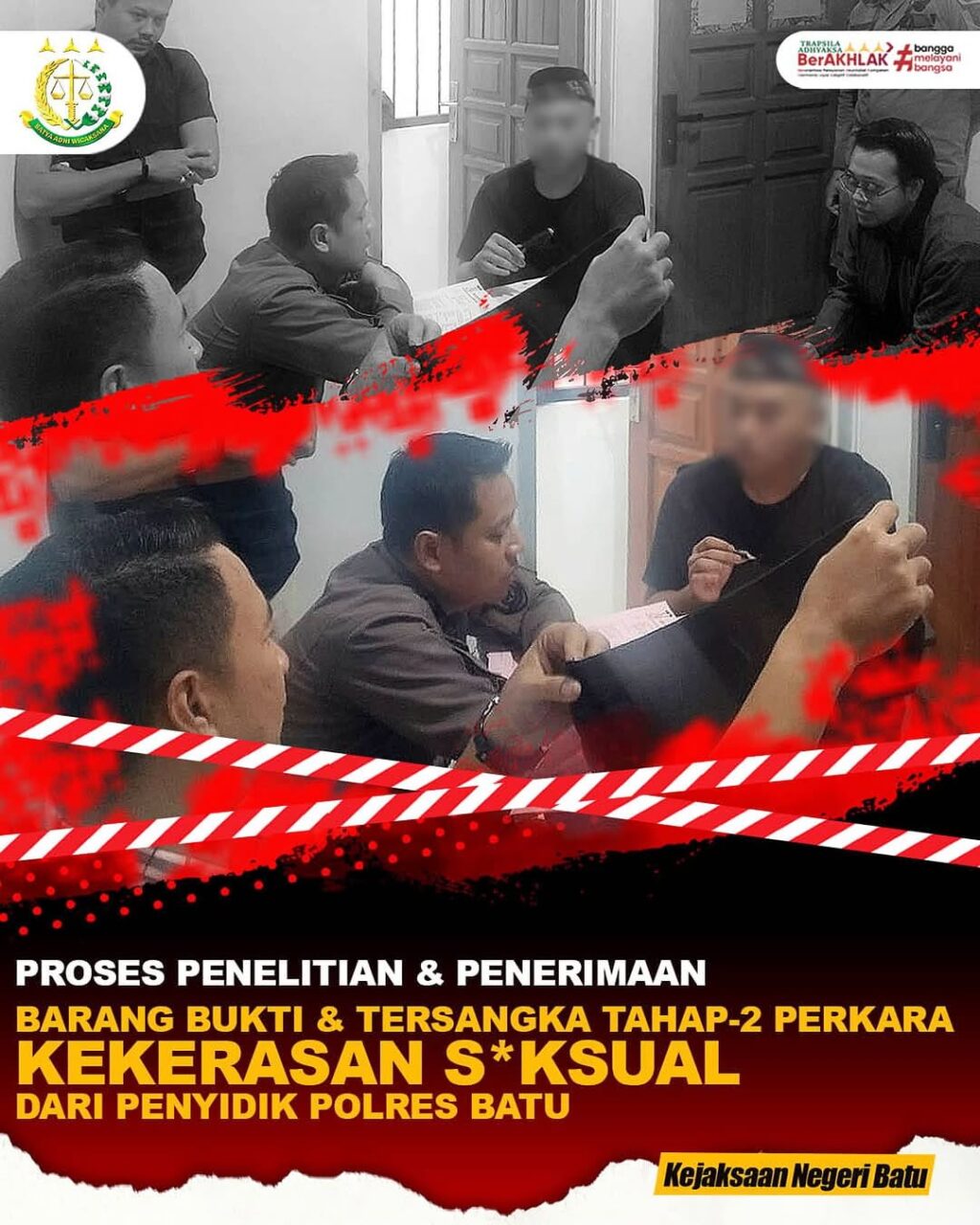 Pada hari Iini, Kamis tanggal 09 April 2025 sekira Pukul 11:00 WIB bertempat di Ruang Tahap-2 Kantor Kejaksaan Negeri Batu, telah dilaksanakan Penyerahan Tersangka dan Barang Bukti (Tahap-2) kepada Petugas Pranata Barang Bukti Fahmi Abdullah Arif, S.S.T., dan Jaksa Fungsional Kejaksaan Negeri Batu Afrid Sundoro Putro, S.H., beserta Jaksa Fungsional Kejaksaan Negeri Batu Koeshartanto, S.H., serta Penyidik Polres Batu dan Tersangka YWS, dalam Perkara Tindak Pidana Umum Kekerasan S*ksual terhadap Korban RN (Sesama Jenis), yang sempat menarik atensi publik terhadap proses penangaan perkara tersebut.