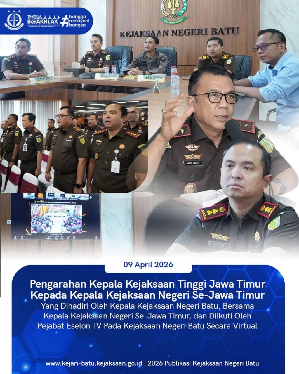 Pada hari ini, Kamis tanggal 09 April 2026 mulai pukul 09.00 WIB bertempat di Ruang Vicon Kantor Kejaksaan Tinggi Jawa Timur, Surabaya, telah dilaksanakan kegiatan Pengarahan oleh Kepala Kejaksaan Tinggi Jawa Timur Agus Sahat ST., S.H., M.H., beserta para Asisten pada Kejaksaan Tinggi Jawa Timur, kepada seluruh Kepala Kejaksaan Negeri se-Jawa Timur, yang dihadiri secara langsung oleh Kepala Kejaksaan Negeri Batu Arya Wicaksana, S.H., M.H., dan diikuti secara virtual dari Ruag Vicon Kantor Kejaksaan Negeri Batu oleh Pejabat Eselon-IV pada Kejaksaan Negeri Batu