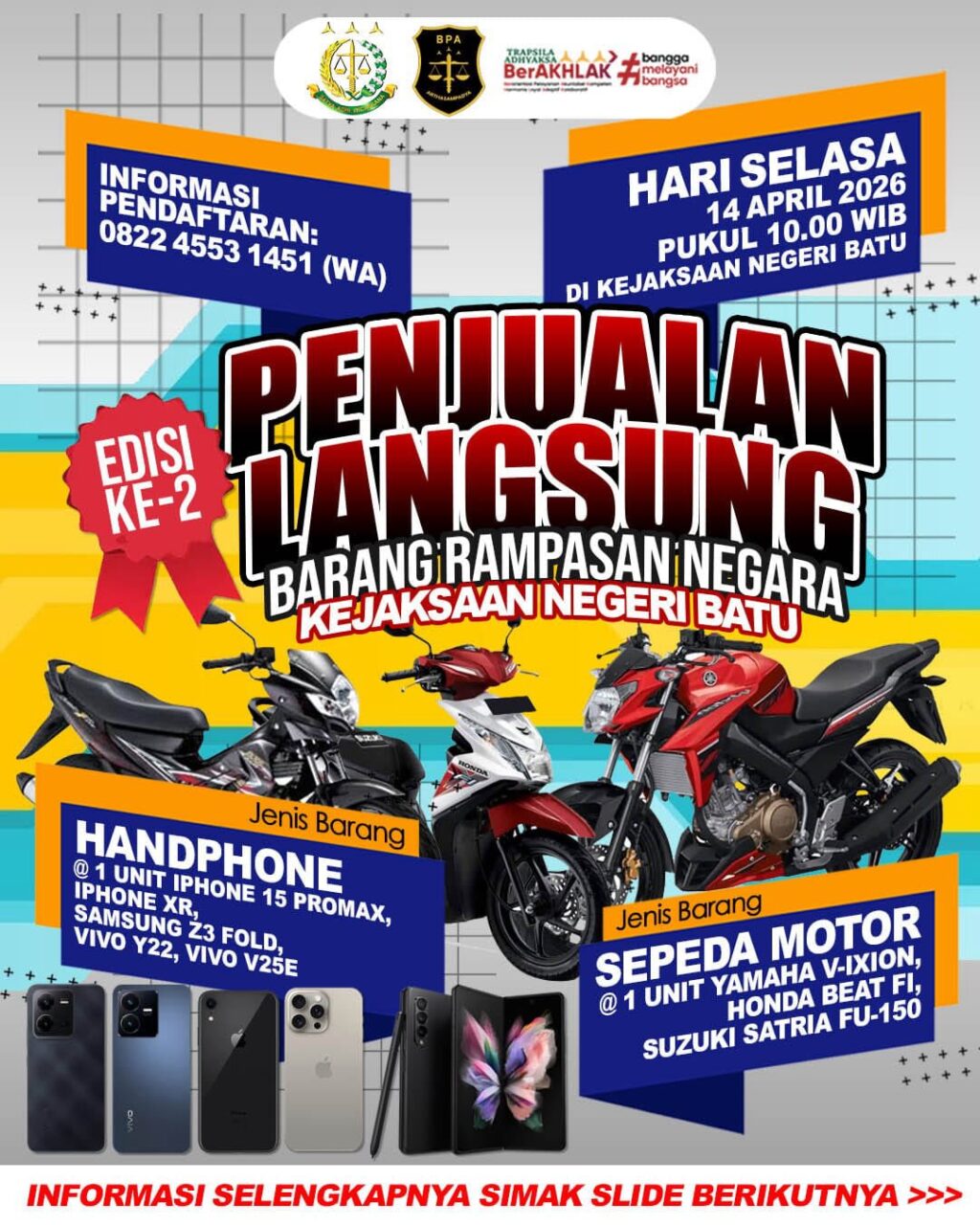 Kali ini Seksi Pemulihan Aset dan Pengelolaan Barang Bukti (PA PBB) pada Kejaksaan Negeri Batu menyampaikan informasi Penjualan Langsung Barang Rampasan Negara, berupa: