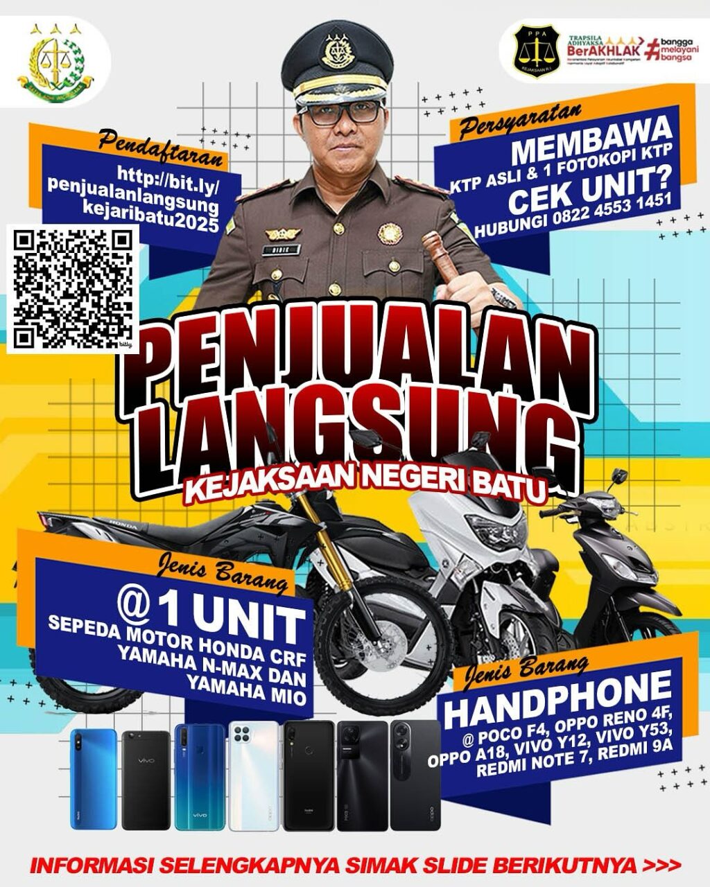 Kali ini Seksi Pemulihan Aset dan Pengelolaan Barang Bukti (PA PBB) pada Kejaksaan Negeri Batu akan memberikan informasi tentang Penjualan Langsung Barang Rampasan Negara, berupa: