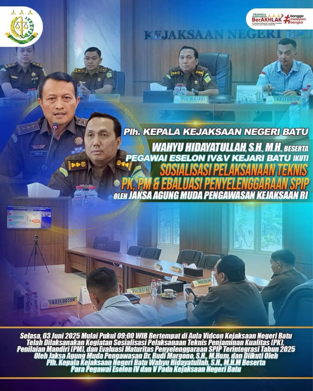 Pada hari ini, Selasa tanggal 03 Juni 2025 mulai pukul 09:00 WIB telah dilaksanakan Sosialisasi terkait Pelaksanaan Teknis Penjaminan Kualitas (PK), Penilaian Mandiri (PM), dan Evaluasi Maturitas Penyelenggaraan SPIP Terintegrasi Tahun 2025 oleh Jaksa Agung Muda Pengawasan Kejaksaan RI Dr. Rudi Margono, S.H., M.Hum., secara virtual dan diikuti oleh Plh. Kepala Kejakaaan Negeri Batu Wahyu Hidayatullah, S.H., M.H., beserta Para Pegawai Waelon IV & V pada Kejaksaan Negeri Batu