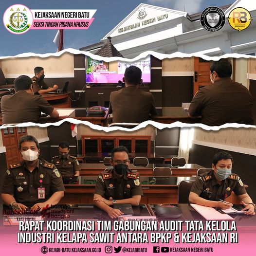 Pada hari ini, Senin tanggal 27 Juni 2022 pukul 09:30 WIB bertempat di Aula Vicon Kantor Kejaksaan Negeri Batu, Kajari Batu Agus Rujito, S.H., M.H., didampingi Kasi Pidsus Endri Riski Erlazuardi, S.H., M.H., dan Jajaran Seksi Tindak Pidana Khusus Kejari Batu menghadiri acara Rapat Koordinasi Tim Gabungan Audit Tata Kelola Industri Kelapa Sawit Antara BPKP & Kejaksaan RI secara virtual