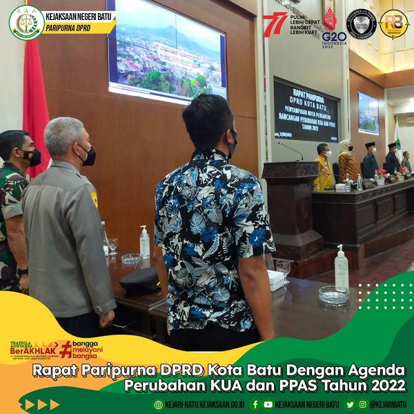 Pada hari ini, Jumat tanggal 12 Agustus 2022 pukul 13:00 WIB bertempat di Rupatama Gedung DPRD Kota Batu telah dilaksanakan kegiatan Rapat Paripurna yang dipimpin secara langsung oleh Ketua DPRD Kota Batu Asmadi, S.P.