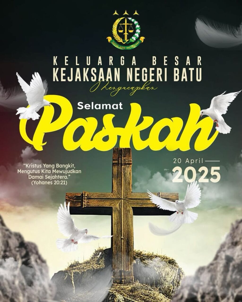 Uncategorized Segenap Keluarga Besar Kejaksaan Negeri Batu mengucapkan Selamat Paskah 2025. Admin Kejari Batu April 24, 2025 Segenap Keluarga Besar Kejaksaan Negeri Batu mengucapkan Selamat Paskah 2025.Semoga kita dapat meneladani pengorbananNya untuk mewujudkan umat yang damai dan sejahtera 🕊️ Continue Reading Previous: KAJARI BATU DAN KASI PIDUM KEJARI BATU HADIRI SUPERVISI BIDANG PIDUM DI KEJATI JATIMNext: Mati satu tumbuh seribu. Kartini memang sudah tiada, namun semangat juangnya tidak boleh padam begitu saja. Leave a Reply Cancel replyYour email address will not be published. Required fields are marked *Comment * Name * Email * Website Save my name, email, and website in this browser for the next time I comment. Related Stories KASUBSI-A BIDANG INTELIJEN KEJARI BATU HADIRI SAFARI RAMADHAN DI MASJID AL-IKHLAS, PADA KELURAHAN TEMAS, KOTA BATU Uncategorized KASUBSI-A BIDANG INTELIJEN KEJARI BATU HADIRI SAFARI RAMADHAN DI MASJID AL-IKHLAS, PADA KELURAHAN TEMAS, KOTA BATU March 4, 2026 Innalillahi Wainaillaihi Rajiun Uncategorized Innalillahi Wainaillaihi Rajiun February 18, 2026 USAI DILANTIK, KEPALA KEJAKSAAN NEGERI BATU SAPA SELURUH PEGAWAI PADA KEJAKSAAN NEGERI BATU Uncategorized USAI DILANTIK, KEPALA KEJAKSAAN NEGERI BATU SAPA SELURUH PEGAWAI PADA KEJAKSAAN NEGERI BATU January 26, 2026