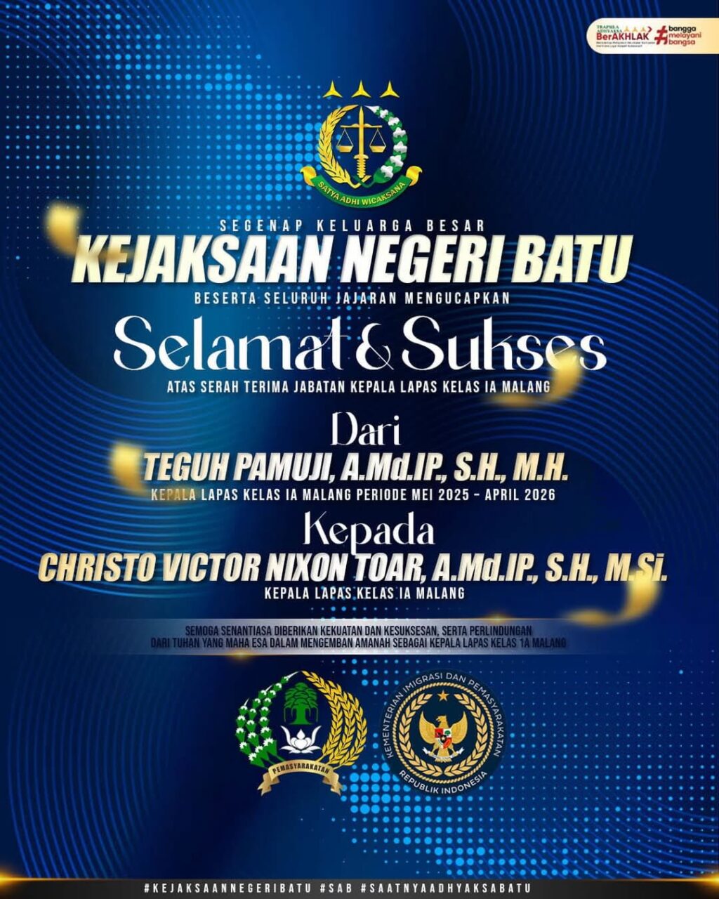 Segenap Keluarga Besar Kejaksaan Negeri Batu mengucapkan Selamat dan Sukses atas serah terima jabatan Kepala Lembaga Pemasyarakatan (Kalapas) Kelas 1A Malang dari Bapak Teguh Pamuji, A.Md.IP., S.H., M.H., kepada Bapak Christo Victor Nixon Toar, A.Md.IP., S.H., M.Si.
