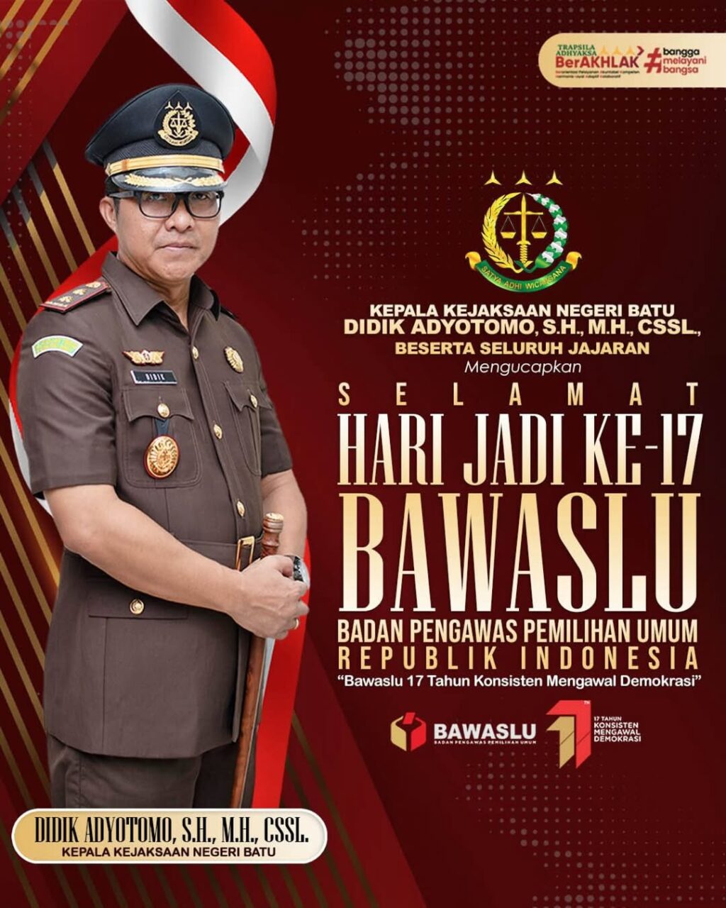 Kepala Kejaksaan Negeri Batu Didik Adyotomo, S.H., M.H., CSSL., beserta Seluruh Jajaran mengucapkan Selamat Hari Jadi Badan Pengawas Pemilihan Umum Republik Indonesia ke-17.