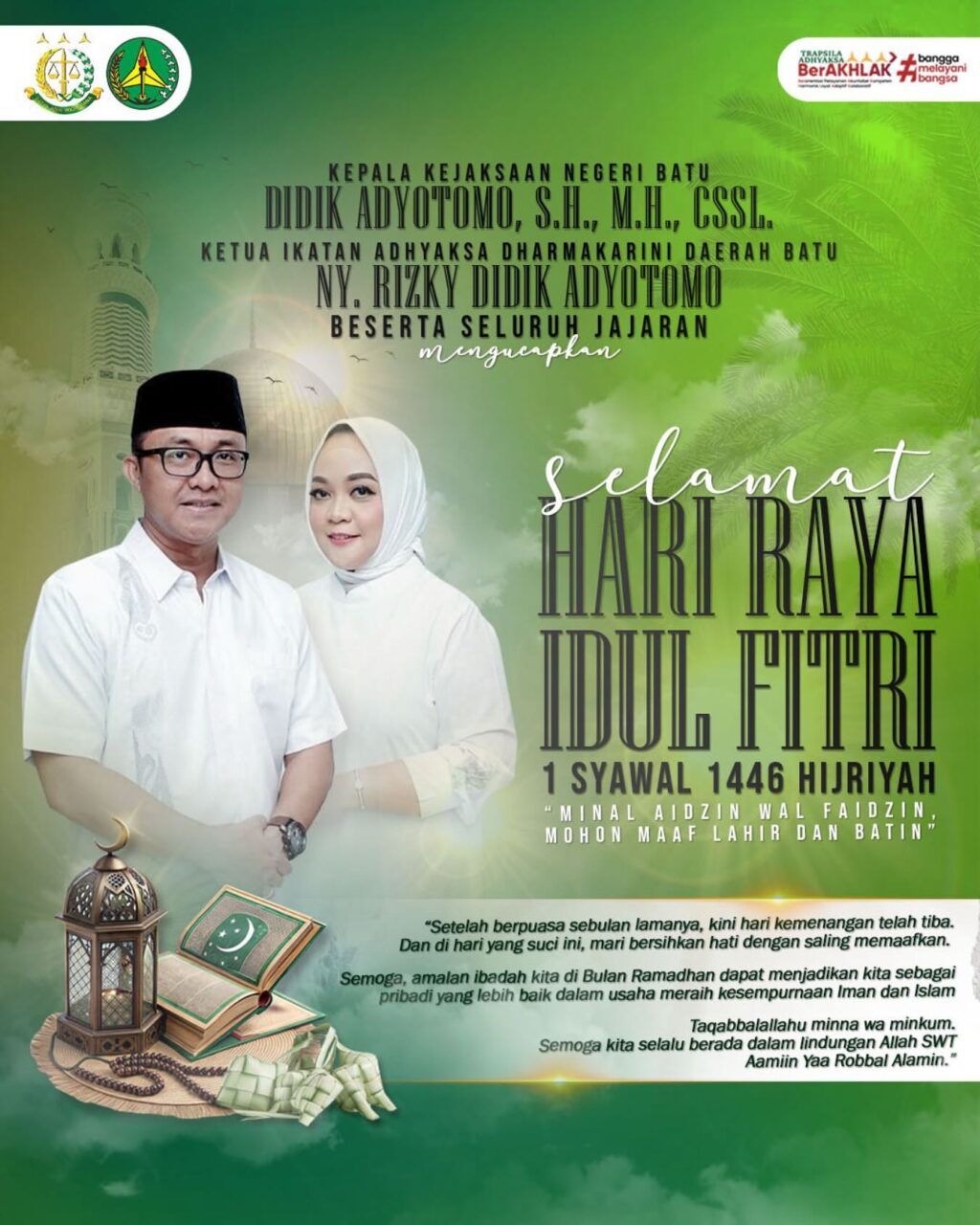 Kepala Kejaksaan Negeri Batu Didik Adyotomo, S.H., M.H., CSSL., Ketua Ikatan Adhyaksa Dharmakarini Daerah Batu Ny. Rizky Didik Adyotomo beserta Seluruh Jajaran mengucapkan Selamat Hari Raya Idul Fitri 1 Syawal 1446 Hijriyah.
