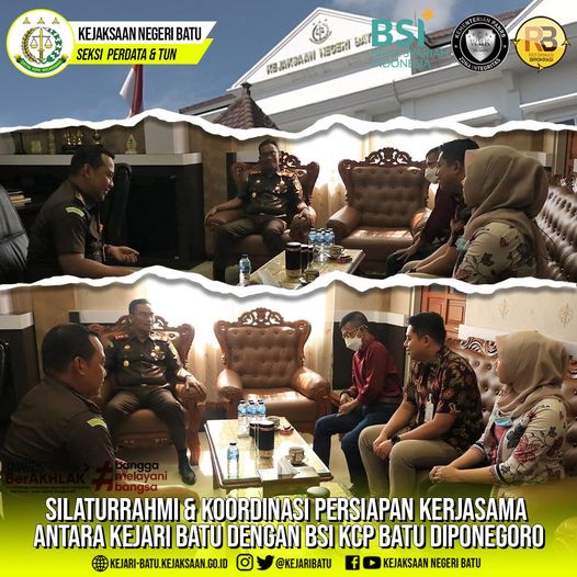Pada hari ini, Rabu tanggal 29 Juni 2022 pukul 10:30 WIB bertempat di Ruang Kajari Batu telah dilaksanakan kegiatan Silaturrahmi dan Koordinasi Persiapan Kerjasama Bidang Perdata & Tata Usaha Negara antara Kejaksaan Negeri Batu dengan PT.Bank Syariah Indonesia, Tbk KCP Batu Diponegoro