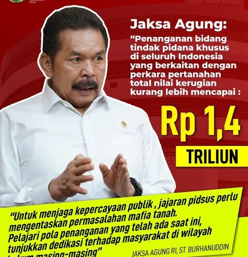 Jaksa Agung menyampaikan “Penanganan bidang tindak pidana khusus di seluruh Indonesia yang berkaitan dengan perkara pertanahan total nilai kerugian kurang lebih mencapai 1,4 Triliun...