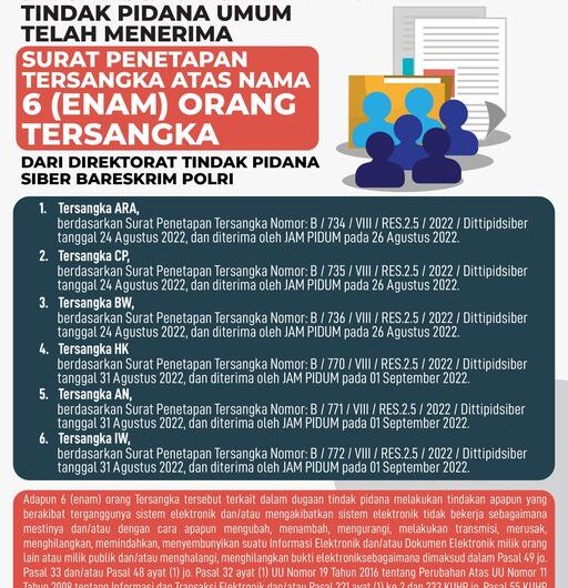 Kamis 1 September 2022, Jaksa Agung Muda Bidang Tindak Pidana Umum (JAM PIDUM) Kejaksaan Agung telah menerima Surat Pemberitahuan Penetapan Tersangka dari Direktorat Tindak...